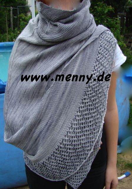 Bei der Netzkante habe ich in jeder 4.Masche Perlen eingestrickt. Erst wollte ich eine Reihe komplett mit Perlen versehen, daß gefiel mir aber nicht, so habe ich die Netzkante noch einmal aufgetrennt. Der Viajante ist nach dem Waschen und Spannen sehr lang geworden, ich bin zum Glück etwas größer als mein Model und somit paßt er.