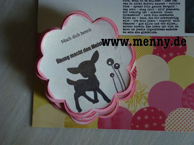 Das LO war ein Selbstläufer, in einem Abo war dieses wunderschöne Papier und da war mir schon klar das ich ein Bild unserer Tochter verarbeiten würde und da unsere Tochter Schafe liebt, besonders ihre MuhKuh, war ebenfalls klar, daß ich mit der Cricut dieses Schäfchen schneiden werde, schließlich habe ich die Cartridges extra wegen dem Schäfchen gekauft. Die Blumen der Karte habe ich mit der Cricut geschnitten.